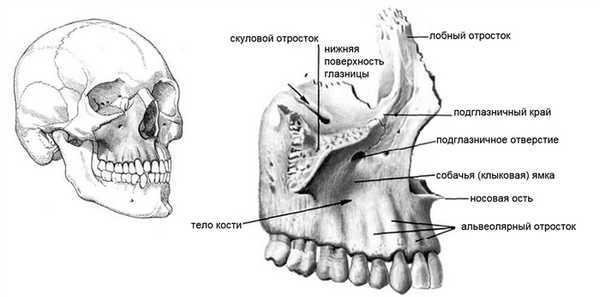 В верхней челюсти различают тело и 4 отростка, из которых лобный направлен вверх, альвеолярный - вниз, нёбный обращен медиально, а скуловой - латерально.