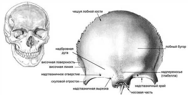 Надбровные дуги, хорошо выраженные и резко выступающие над глазницами, обычно придают лицу некоторую суровость. На лобной чешуе, несколько выше медиальных концов надбровных дуг, расположена гладкая, более или менее вдавленная площадка, которая носит название надпереносья (глабеллы). В толще лобной чешуи имеется костная полость - лобная пазуха, которая часто вдается внутрь надбровных дуг.