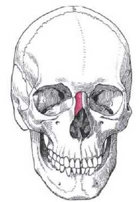 , vomer. Непарная кость, формирующая часть носовой перегородки. Расположена между клиновидной, небной костями, верхней челюстью и перпендикулярной пластинкой решетчатой кости. Рис. Ж.