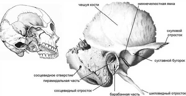 Каменистая часть височной кости имеет форму трехгранной пирамиды, в которой находится барабанная полость среднего уха, в ней располагаются три слуховые косточки - наковальня, молоточек и стремечко. В толще пирамиды располагаются органы слуха и равновесия. На задней поверхности пирамиды имеется отверстие внутреннего слухового прохода, ведущего во внутреннее ухо. На нижней поверхности пирамиды находится наружное отверстие сонного канала, через которое проходит внутренняя сонная артерия, кровоснабжающая головной мозг.