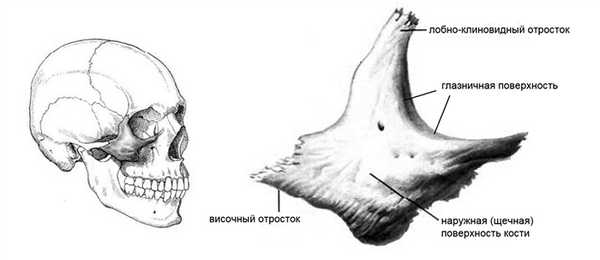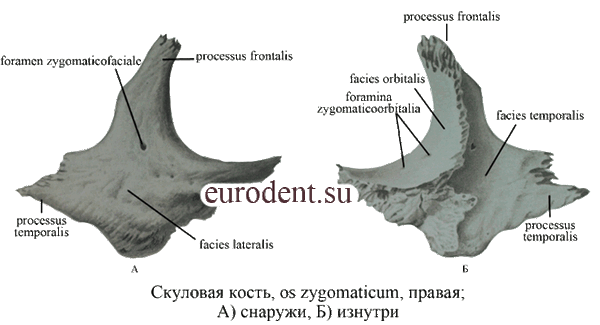 Скуловая кость, os zygomaticus, парная, входит в состав боковых отделов лицевого черепа. На ней различают три поверхности. Кнаружи обращена латеральная поверхность, facies lateralis, неправильно-четырехугольной формы, выпуклая, особенно в области выступающего бугра.
