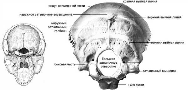 В центре поверхности затылочной чешуи находится наружный затылочный выступ, который легко прощупывается под кожей затылка, играющий роль в формировании рельефа поверхности черепа. От наружного затылочного выступа вправо и влево идут верхняя и нижняя выйные линии, к которым прикрепляются мышцы и фасции шеи.