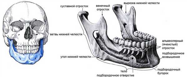 Нижняя челюсть - большая непарная кость, имеет форму подковы и является единственной подвижной костью черепа (рис. 45). Она состоит из тела и двух ветвей, расположенных к нему под тупым углом.