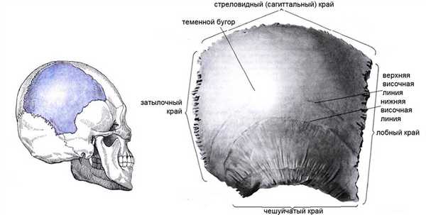 Теменная кость (рис.40) - это вогнутая четырехугольная пластинка, целиком входящая в состав свода черепа. Самое выпуклое место ее находится посередине кости и называется теменными бугром, который резко выступает у детей, являясь характерной особенностью детского черепа. Иногда эти бугры вместе с лобными буграми достигают такой величины, что голова ребенка приобретает почти четырехугольную форму. Под теменным бугром проходят две дугообразные височные линии ограничивающие сверху височную впадину, в которой располагается височная мышца, выполняющая жевательную функцию. Три края темен ной кости - верхний и два боковых зазубрены. Они соединяют теменную кость с соседними костями, нижний, четвертый край вогнутый, слегка заостренный и, наподобие чешуи, соединяется с нижележащей височной костью.