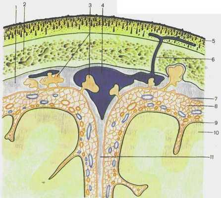 1 — dura mater; 2- calvaria; 3 — granulationes arachnoidales; 4 — sinus sagittalis superior; 5 — cutis; 6 — v. emissaria; 7 — arachnoidea; 8 — cavum subarachnoidale [cavitas subarachnoidalis]; 9 — pia mater; 10 — encephalon; 11 — falx cerebri.