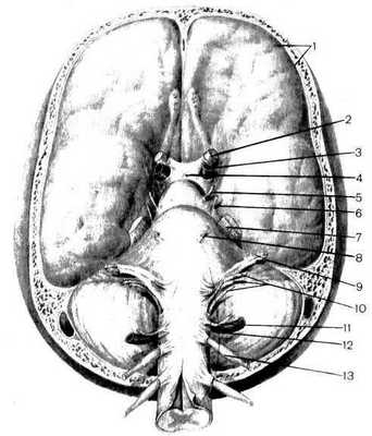 1—dura mater encephali [cranialis]; 2 — n. opticus; 3— a. carotis interna; 4 — infundibulum; 5 — n. oculomotorius; 6—n. trochlearis; 7 — n. trigeminus; 8 — n. abducens; 9—n. facialis et n. vestibulocochlearis; 10—nn. glossopharyn-geus, vagus et accessorius; 11 —n. hypoglossus; 12 — a. vertebralis; 13 — n. spi-nalis.