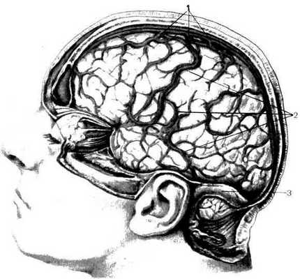 1 места впадения вен в верхний сагиттальный синус; 2 — поверхностные мозговые вены; 3 — сигмовидный синус.