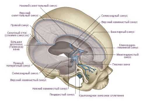 Помимо этого, за счет анастомозов синусов с диплоическими венами, венозными выпускниками и венозными сплетениями (позвоночными, базилярными, подзатылочными, крыловидными и др.) венозная кровь от головного мозга может оттекать в поверхностные вены головы и шеи.