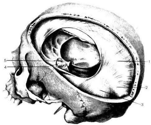 1 — falx cerebri; 2 — sinus rectus; 3 — tentorium cerebelli; 4 — diaphragma sellae; 5 — n. opticus et a. carotis interna.