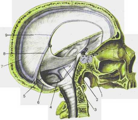 1 — sinus cavernosus; 2 — sinus petrosus inferior; 3 — sinus petrosus superior; 4 — sinus sigmoideus; 5 — sinus transversus; 6 — sinus occipitalis; 7 — sinus sa-gittalis superior; 8 — sinus rectus; 9 — sinus sagittalis inferior.