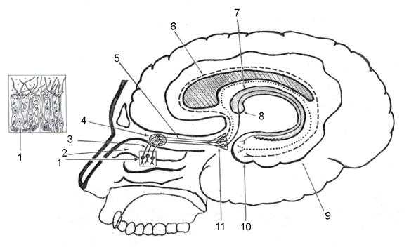 Рис. 8. Проводящие пути обонятельного анализатора. 1 - cellulae neurosensoriae olfactoriae; 2 - concha nasalis superior; 3 - nn. olfactorii; 4 - bulbus olfactorius; 5 - tractus olfactorius; 6 - corpus callosum; 7 - fornix; 8 - corpora mammillare; 9 - gyrus parahippocampalis [hippocampi]; 10 - uncus; 11 -trigonum olfactorium.