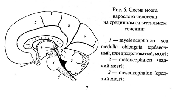 4. промежуточный мозг; 5. конечный мозг.