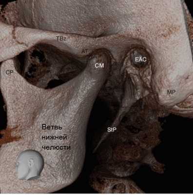Рисунок 3 3D визуализация изображений конусно-лучевой компьютерной томографии левого височно-нижнечелюстного сустава у 62-летнего мужчины. АТ Суставной бугорок, СМ мыщелок нижней челюсти, СР венечный отросток, ЕАС наружный слуховой проход, МР сосцевидный отросток, StP шиловидный отросток, TBz скуловой отросток височной кости