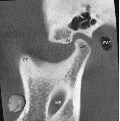 Рисунок 4 Сагиттальный срез конусно-лучевой компьютерной томографии височно-нижнечелюстного сустава у 22-летней женщины. АТ Суставной бугорок, СМ мыщелок нижней челюсти, СР венечный отросток, ЕАС наружный слуховой проход, МF отверстие нижней челюсти