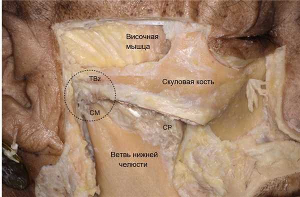Рисунок 2 Правый боковой вид разреза головы трупа, на котором видна область височно-нижнечелюстного сустава (черный пунктирный круг). СМ мыщелок нижней челюсти, СР венечный отросток, TBz скуловой отросток височной кости