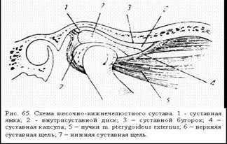 Образуют сустав головка рога нижней челюсти и суставная поверхность (ямка) височной кости. Между этими костными образованиями располагается волокнистый внутрисуставной диск, который со всех сторон сращен с капсулой сустава. Способствуют удержанию сустава в правильном положении связки и мышцы. Они ограничивают амплитуду движения в суставе. Попытка превысить это функциональное ограничение вызывает боль и препятствует повреждению ВНЧС.