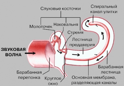 - Звуковой импульс доходит до уха и в нем попадает по мембране барабанной перепонки. Перепонка от этих импульсов начинает создавать вибрацию. Эти импульсы передаются на звуковые косточки: стремя, наковальню и молоток.