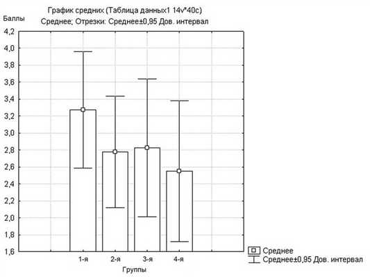 Средняя оценка переносимости фиброэндоскопии детьми по шкале ВАШ составила в группах 3,3±2,15; 2,8±2,06; 2,8±2,54 и 2,5±2,59 соответственно (рис. 2). Хотя этот показатель оказался наибольшим в 1-й группе, в которой в качестве препарата подготовки использовали физиологический раствор, и наименьшим — в 4-й группе, в которой использовали смесь 0,05% раствора ксилометазолина и 10% раствора лидокаина, при статистическом анализе результатов достоверной разницы между группами не получено (p>0,05).