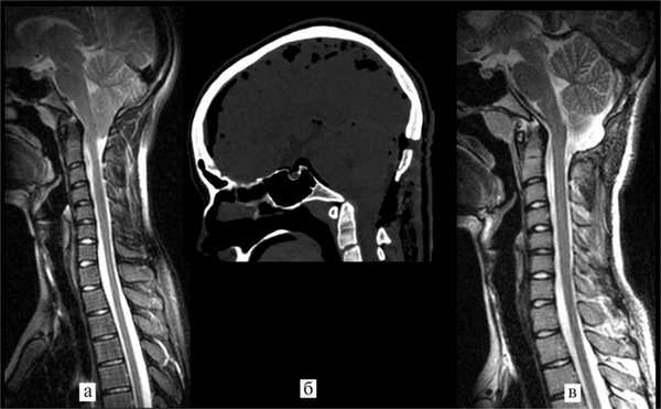 Жалобы, клиническая картина и результаты обследования. Пациентка Г., 16 лет, обследовалась в связи с жалобами на упорные интенсивную инвалидизирующую головную боль и боли в шейно-затылочной области в течение 2 лет. Кроме этого, родственники наблюдали у больной два приступа генерализованных тонических судорог с отключением сознания; электроэнцефалографические данные не подтверждали эпилепсию. Офтальмофундоскопия не выявила признаков внутричерепной гипертензии. При МРТ-обследовании выявлена клиновидная деформация миндаликов мозжечка с их смещением на 17 мм ниже большого затылочного отверстия; гидроцефалии, внутричерепных объемных образований или сирингомиелии не наблюдалось (рис. 1, а). Пациентка госпитализирована для хирургического лечения с диагнозом аномалия Киари-1. При госпитализации в неврологическом статусе имел место спонтанный горизонтальный нистагм, других объективных симптомов не было.