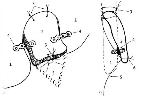 Рис. 2. Схематичное изображение результата операции. а — вид сзади и слева; б — сагиттальный срез (вид слева). 1 — «материнская» кость (чешуя затылочной кости; на рис. б, обозначена пунктирной линией); 2 — перемещенный костный лоскут; 3 — шелковые лигатуры, которыми фиксирован верхний край костного лоскута; 4 — резорбируемые мини-пластины, которыми нижний край костного лоскута жестко фиксирован в новом положении (на рис. а — фрагменты мини-пластин, расположенные за костным лоскутом, обозначены пунктирной линией); 5 — лоскут из коллагенового матрикса, которым выполнена пластика ТМО; 6 — шелковая лигатура, подтягивающая ТМО к костному лоскуту.