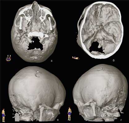 Рис. 3. Данные К.Т. спустя 12 ч после операции; 3-мерная реконструкция. а — вид снизу; б — вид изнутри полости черепа; в — вид сзади и справа; г — вид сзади и слева (костный лоскут выделен пунктиром).