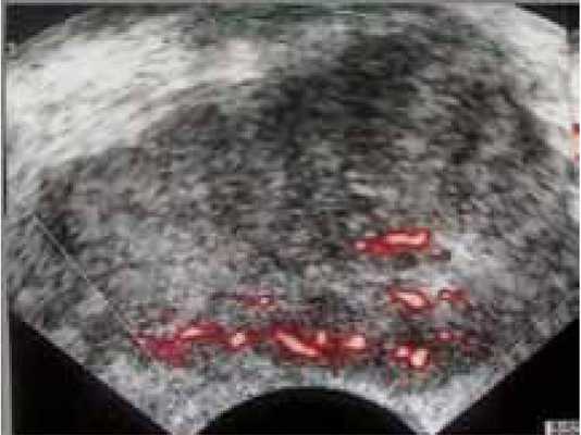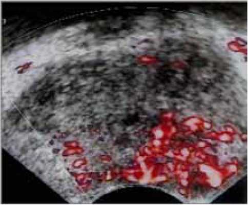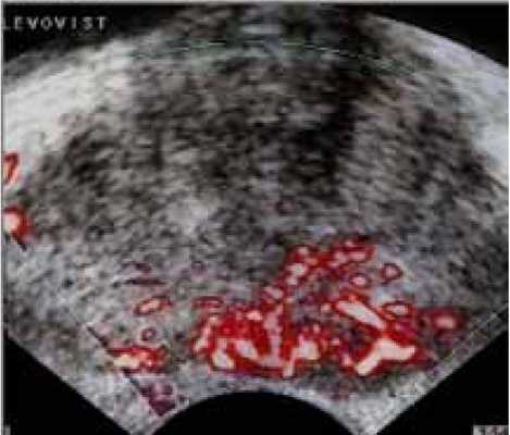 Однако, новые УЗ-технологии опровергают это мнение. Выполнение УЗИ также дает информацию о центральной, периферической части железы и о капсуле. УЗИ с допплеровским картированием, особенно при использовании эхоконтрастных средств, позволяет улучшить визуализацию и распространенность РПЖ (рисунки 2, 3).
