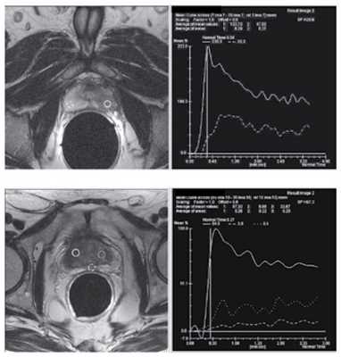 Известно, что злокачественные клетки имеют очень низкий метаболизм цитрата, но высокое содержание холина и креатина. Поэтому показатель соотношения холин-креатин/цитрат может способствовать диагностике рака. МР-спектроскопия уже давно существует на рынке, и последние работы говорят о том, что ее действительно можно использовать как дополнительный метод в диагностике РПЖ (рисунок 6).