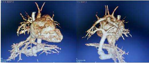 Выделяют 4 формы ТАДЛВ [4]: 1) кардиальная форма - легочной венозный коллектор впадает в венечный синус сердца или в правое предсердие (рис. 3-1); 2) подкардиальная форма - легочной венозный коллектор впадает в нижнюю полую вену (рис. 3-2); 3) надкардиальная форма - легочные вены впадают в коллектор, а он - в левую плечеголовную вену (рис. 3-3); 4) смешанная форма - два легочных венозных коллектора впадают в правое предсердие или в полые вены.