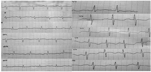 Рис. 3. ЭКГ: синусовый ритм, отклонение электрической оси сердца вправо, перегрузка правого желудочка