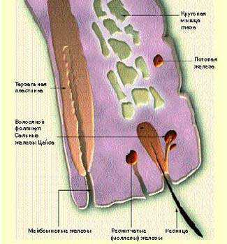 Мейбомиевая киста. Причиной развития мейбомиевой кисты, или халазиона, является закупорка протока мейбомиевой железы, жировой железы хрящевой пластинки века. В каждом веке имеется около 30 желез, открывающихся на заднем его крае. Секрет этих желез служит для смазки краев век и составляет внешний липидный слой слезной пленки.