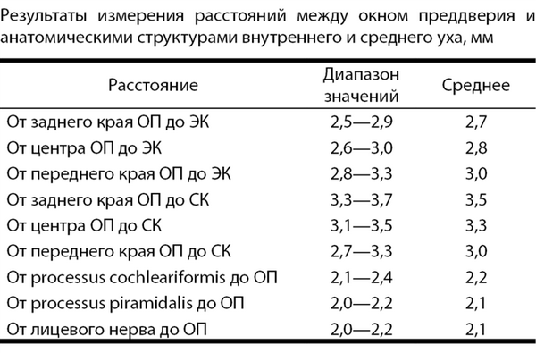 Для определения глубины вестибулостомы использовали данные, полученные при измерении расстояний от processus cochleariformis, processus piramidalis, барабанной порции лицевого нерва до подножной пластинки стремени. На основании полученных измерений определена средняя толщина костной ткани, которую нужно удалять, чтобы достичь преддверия — 2,1±0,1 мм. Результаты измерений представлены в таблице.