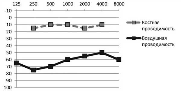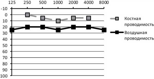 У данных пациентов средние показатели тональной пороговой аудиометрии по воздушной проводимости (ВП) составляли 62,3±4,6 дБ, по костной проводимости (КП) — 12,0±2,7 дБ (рис. 1); при тимпанометрии регистрировали тимпанограмму типа As (по классификации Jerger).