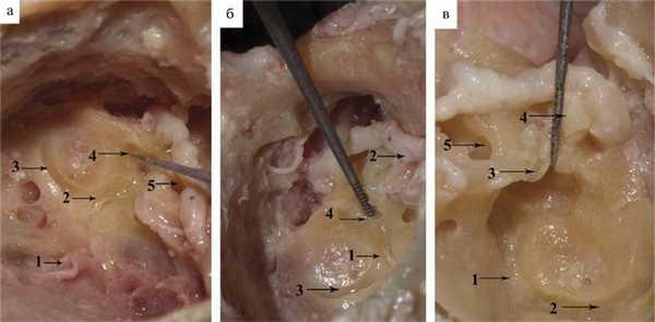 Рис. 2. Измерения на кадаверных височных костях. а — измерение дистанции от ОП до ЭК, правое ухо; 1 — ЭнМ со вскрытым ЭнП, 2 — водопровод преддверия с ЭнП, 3 — фронтальный ПК, 4 — ЭК, 5 — ниша окна улитки. б — измерение дистанции от ОП до СК, правое ухо; 1 — водопровод преддверия с ЭнП, 2 — лицевой нерв, 3 — фронтальный ПК, 4 — СК. в - измерение дистанции от processus cochleariformis до ОП, левое ухо; 1 — водопровод преддверия с ЭнП, 2 — фронтальный ПК, 3 — подножная пластинка стремени, 4 — processus cochleariformis, 5 — ниша окна улитки.