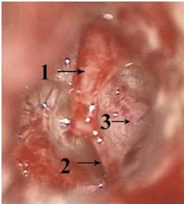Рис. 4. Интраоперационные находки пациента А., левое ухо. 1 — интактный длинный отросток наковальни, 2 — сухожилие стременной мышцы прикрепляется к длинному отростку наковальни, 3 - аплазия окна преддверия.