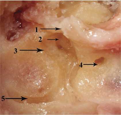 Рис. 3. Правая кадаверная височная кость. 1 — лицевой нерв, 2 — sacculus, 3 — utriculus, 4 — ампулярный конец заднего полукружного канала, 5 — верхний полукружный канал.
