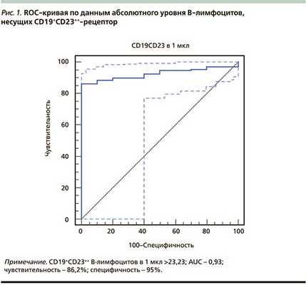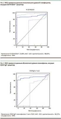 Результаты. Уровень В-лимфоцитов, несущих CD19+CD23++-рецептор, служит высокоинформативным диагностическим критерием для пациентов с АБА. При абсолютных значениях уровня В-лимфоцитов, несущих CD19+CD23++-рецептор, 23,23 кл/мкл, и относительном уровне ≥5,40% можно с высокой степенью достоверности говорить о наличии у пациента АБА. Для подтверждения диагноза АБА следует определять уровень эозинофилов, несущих CD23+IgE+-рецептор. При абсолютном значении уровня этих клеток ≥73,01 кл/мкл и относительном уровне ≥35,10% можно с высокой степенью достоверности говорить о наличии у пациента АБА.