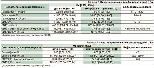 Материал и методы. Обследованы 160 детей в возрасте от 6 до 18 лет, в т.ч. 130 пациентов с АБА и 30 детей контрольной группы. Определяли относительный и абсолютный уровни CD19+, CD19+CD23++ В-лимфоцитов, CD23+IgE+-эозинофилов.