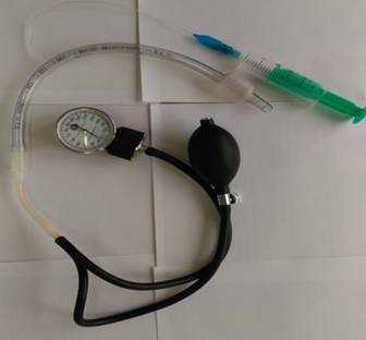 В 125 наблюдениях инвагинация устранена при нагнетании в толстую кишку воздуха с контролем создаваемого давления. Этот метод используется нами у детей любого возраста. Для введения в прямую кишку воздуха мы применяем интубационную трубку (трубку для интубации трахеи), размер которой подбирается в зависимости от возраста ребенка. Трубка с помощью переходника соединяется с манометром и баллоном Ричардсона (рис. 6). Преимуществом данного устройства является наличие манжетки, которая позволяет создать герметизм при нагнетании воздуха в толстую кишку.
