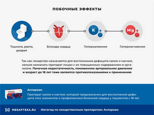 Прием мочегонных лекарственных средств («Фуросемид», «Торасемид»), препаратов наперстянки («Дигоксин», «Строфантин», «Коргликон»), антибиотиков и цитостатиков вызывает гипокалиемию, в результате которой развивается компенсаторный дефицит магния. Прием «Аспаркама» устраняет электролитный дисбаланс и побочные фармакологические эффекты от употребления лекарственных средств.