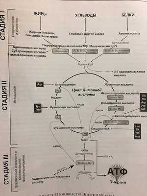 1 этап - это получение более простых молекул( в цикл образования энергии) из углеводов(У), жиров(Ж) и белков пищи(Б). Углеводы расщепляются до моносахаров(глюкоза,фруктоза), жиры до жирных кислот, белки до аминокислот. "Расщепление" Б,Ж,У происходит как к кислородной среде(аэробной), так и в бескислородной(анаэробной) среде. Это крайне важно! Так как из анаэробного гликолиза 1 молекулы глюкозы образуется - 2 молекулы АТФ, из аэробного (кислородного) гликолиза 1 молекулы глюкозы - образуются 36 молекул АТФ, из аэробного окисления 1 молекулы жирной кислоты - 146 молекул АТФ, ( жиры и белки в бескислородной среде вообще не расщепляются!, вывод - например, при нелеченной анемии(дефицитО2) снижение веса почти невозможно). Так, и усвоение 1 молекулы глюкозы требует 6 молекул О2, а 1 молекулы жирных кислот -23 молекулы О2. Вывод - жиры основной источник энергии, и всем нужен О2.