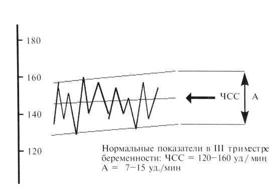 - базальная ЧСС в пределах 110-160 ударов в минуту. При доношенной беременности и нормальном состоянии плода частота сердечных сокращений (ЧСС) равна 110-160 уд./мин (в среднем 140-145). Нормальная сердечная деятельность плода всегда свидетельствует об отсутствии гипоксии (кислородного голодания);
