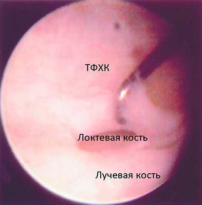 На рисунке представлена артроскопическая картина лучезапястного сустава. Связка ТФХК разорвана и хирург использует крючок, чтобы очистить участок кости для фиксации связки на место. Через образовавшийся вследствие разрыва дефект видна головка локтевой кости. Рядом с ней расположена лучевая кость.