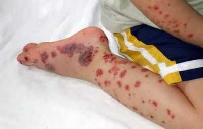 - Появление геморрагической сыпи на ногах, руках и туловище;