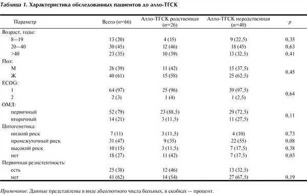 В исследование включили 66 пациентов в возрасте от 8 до 60 лет с диагнозом ОМЛ, которым проведена алло-ТГСК в первой ремиссии в период с 2003 по 2012 г.; медиана наблюдения 12 мес (3—101 мес).