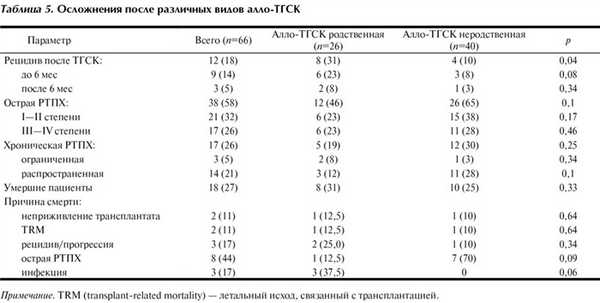 Из неинфекционных осложнений, связанных с алло-ТГСК, только острая РТПХ IV степени оказывала существенное влияние на выживаемость пациентов — 0. При вариантах I—II и III степени острой РТПХ 5-летняя ОВ была равна 80%.