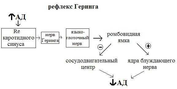 - блок-схема рефлекса регуляции АД с синокаротидных рефлексогенных зон (рефлекс Геринга).