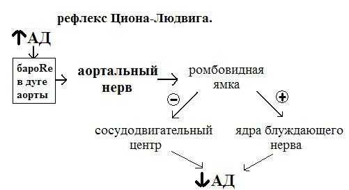 Увеличение артериального давления => Раздражение барорецепторов высокого давления рецепторной зоны дуги аорты => Увеличение частоты импульсации в афферентных нервных волокнах, идущих в составе депрессорного нерва (веточка вагуса) => Активация депрессорной зоны сосудодвигательного центра в передних отделах продолговатого мозга у нижнего угла ромбовидной ямки (гигантоклеточное ретикулярное ядро, ретикулярное вентральное ядро, каудальное и оральное ядра моста, заднее ядро Х нерва) => Активация ядер блуждающего нерва (парасимпатической нервной системы) через медиатор ацетилхолина на м-хр приводит к снижению частоты работы сердца (подавление активности аденилатциклазы и открытие К каналов в кардиомиоцитах СА узла), уменьшению скорости распространения возбуждений по проводящей системе сердца, силы сокращений предсердий и желудочков => Уменьшение ударного и минутного объемов крови => Снижение артериального давления