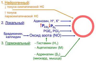 - Местные - они потому так и называются, что реализуются на месте, на уровне сосудистых стенок, которые сами выступают в роли железы и продуцируют БАВ (биологически активные вещества), обладающие способностью отвечать на изменение артериального давления, механические раздражения или на присутствие медикаментозных препаратов воздействием на гладкомышечные слои сосудов, заставляя последние расслабляться или сокращаться;