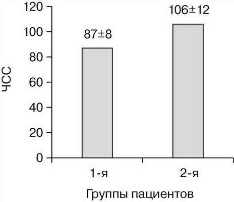 Средняя ЧСС у детей 2-й группы на этапе индукции в анестезию составила 106±12 уд/мин, что на 21,8% больше, чем у детей 1-й группы, у которых данный показатель составил 87±8 уд/мин; р