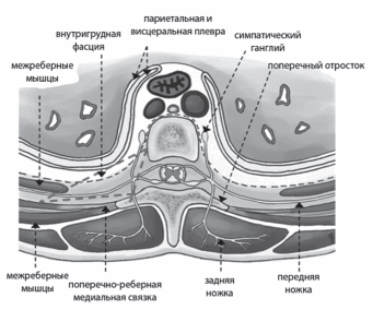 Торакальная паравертебральная блокада по существу является проксимальной межреберной блокадой, при которой нервные корешки анестезируются непосредственно в паравертебральном пространстве, после их выхода из межпозвоночного отверстия. Торакальное паравертебральное пространство имеет клиновидную форму. Кпереди от него лежат париетальная плевра и легкое, медиально — тело позвонка, межпозвоночный диск и межпозвоночное отверстие, сзади — поперечный отросток и поперечнореберная связка. Проксимальная часть ребра лежит выше паравертебрального пространства [7]. В грудном отделе паравертебральное пространство включает соматические нервы, цепочку симпатических нервов, сосуды и рыхлую соединительную ткань.